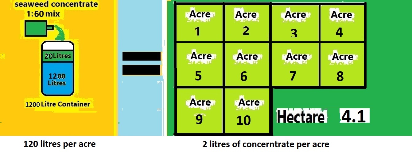 I base my calculations on 2 litres of seaweed fertiliser concentrate to 1 acre or .41 hectres and have found this works great for a twice a year application once in the spring and once in the autumn season on a flat 1 acre farm grass paddock.