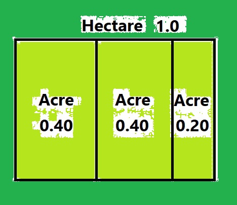 "so 1 acre to .40 hectres or 1 hectre to 2.5 acres ( .40 +.40 +.20 = 1.00 ) , 1 acre = 4000 m2 etc......":