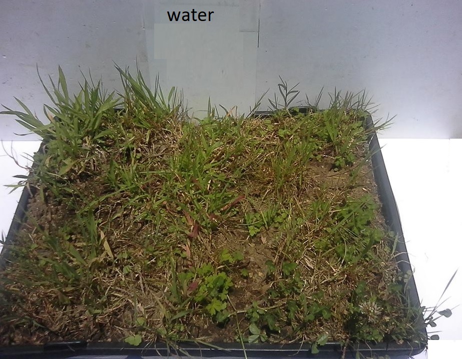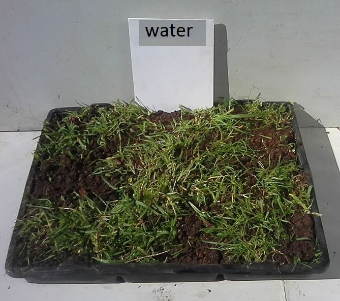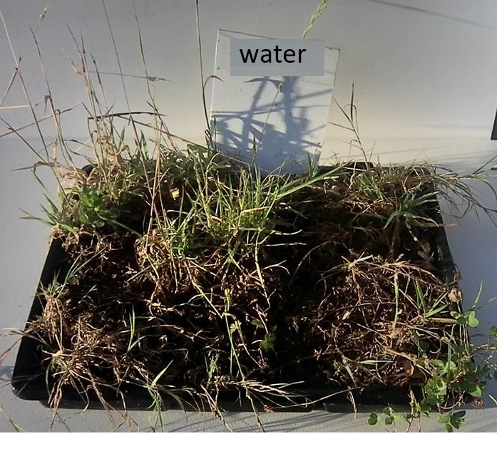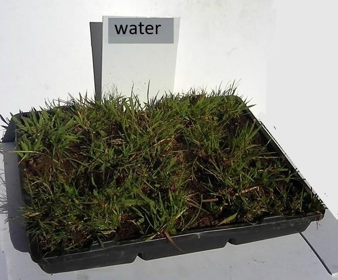 The water only tray has produced shoots, but the lack of nutrients and the lack of endophyte have resulted